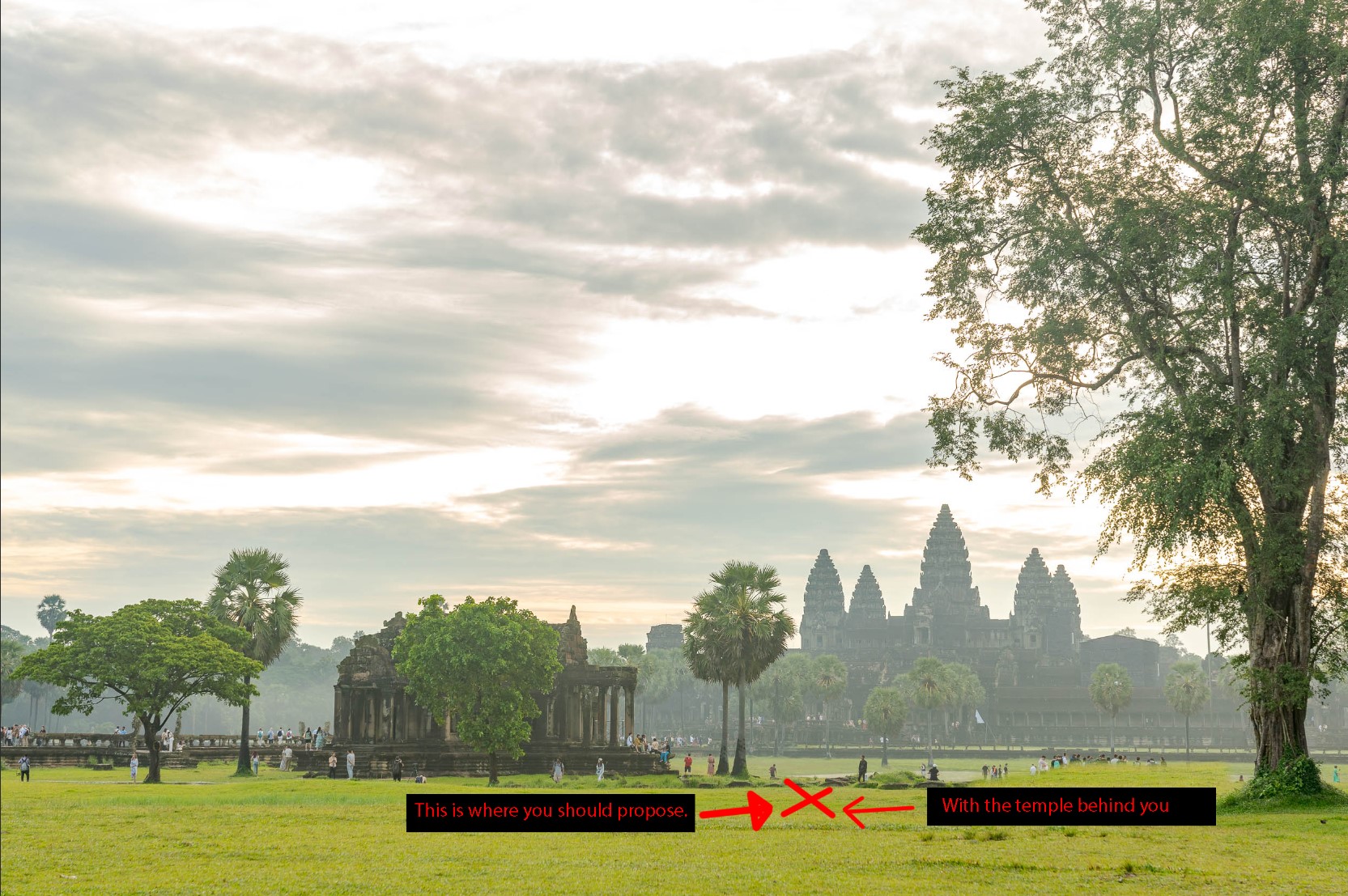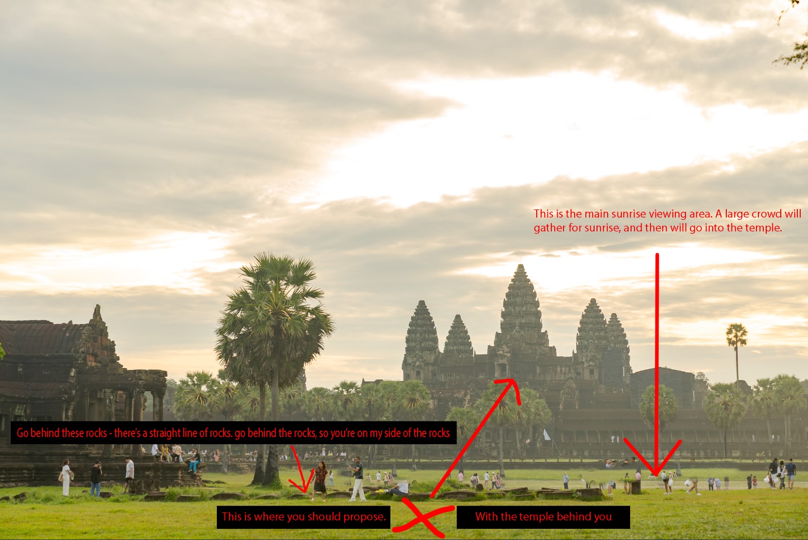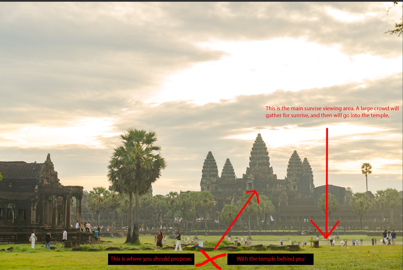 Most people watch the Angkor Wat sunrise and arrive at the temple before light, at around 5am. I recommend doing the proposal at 6.30am, when the light is optimal.